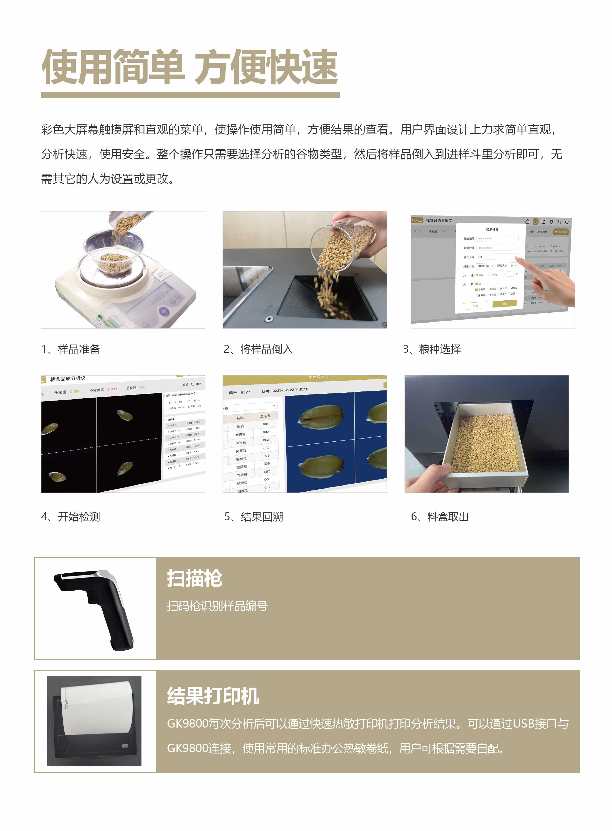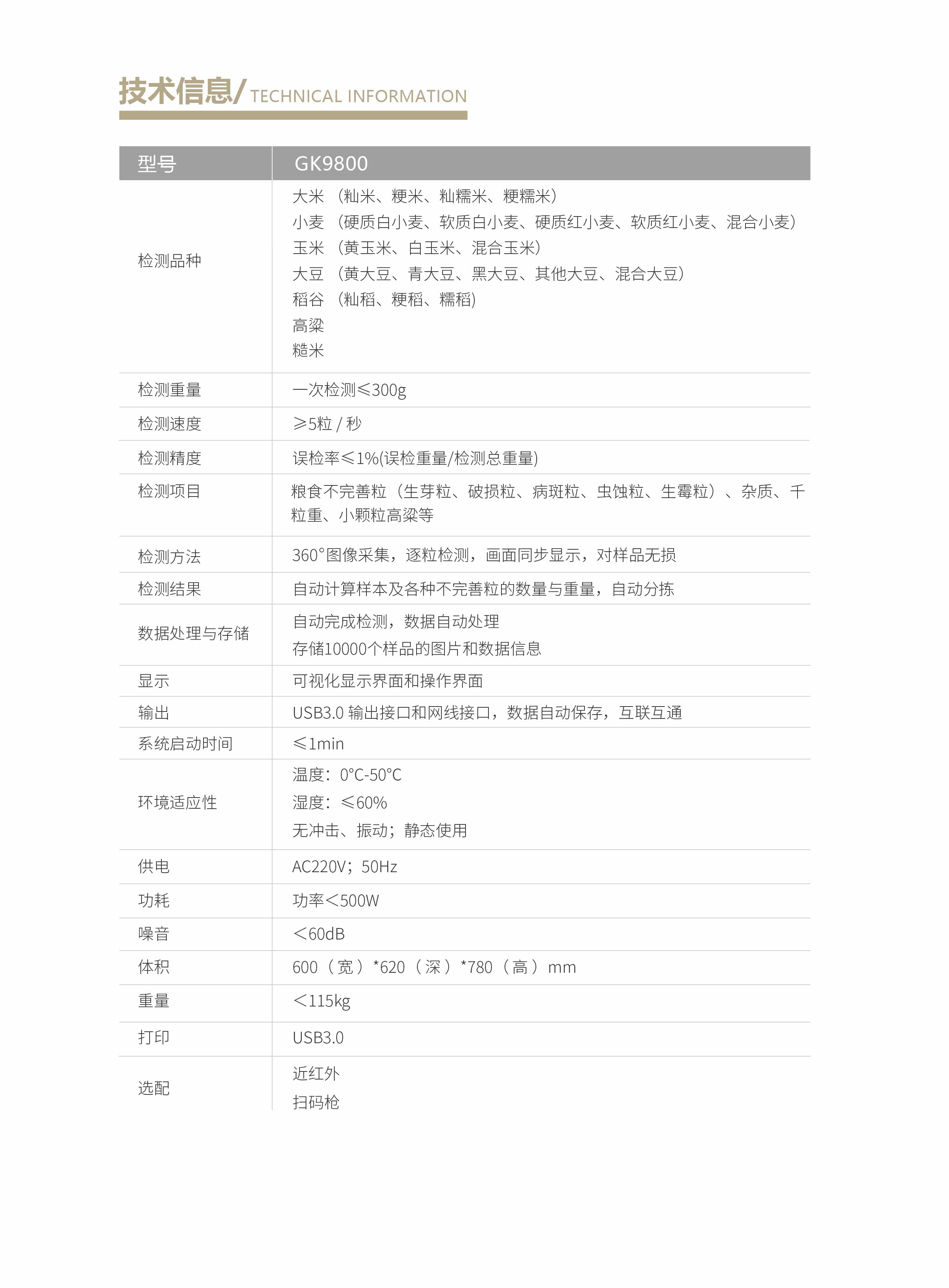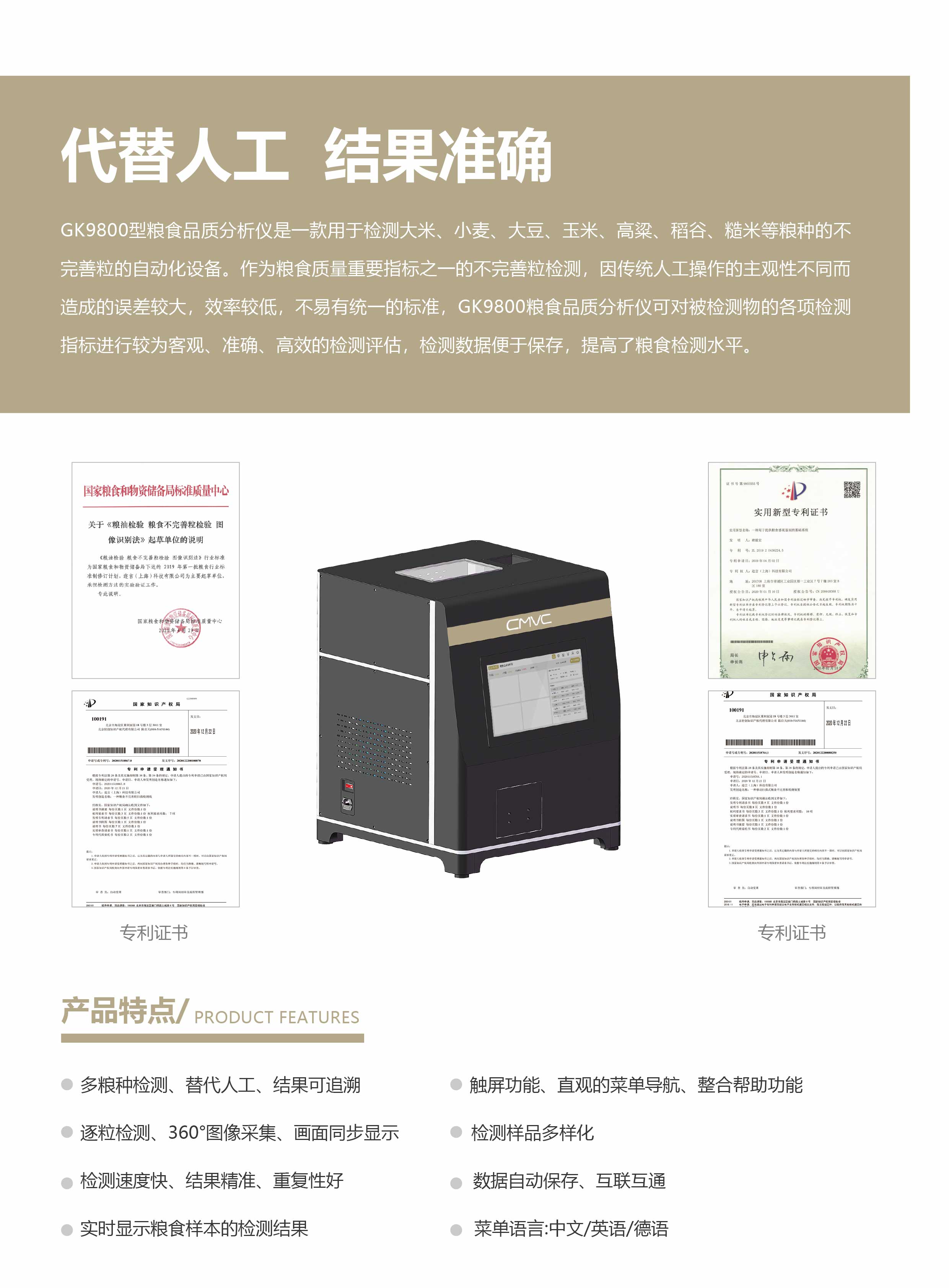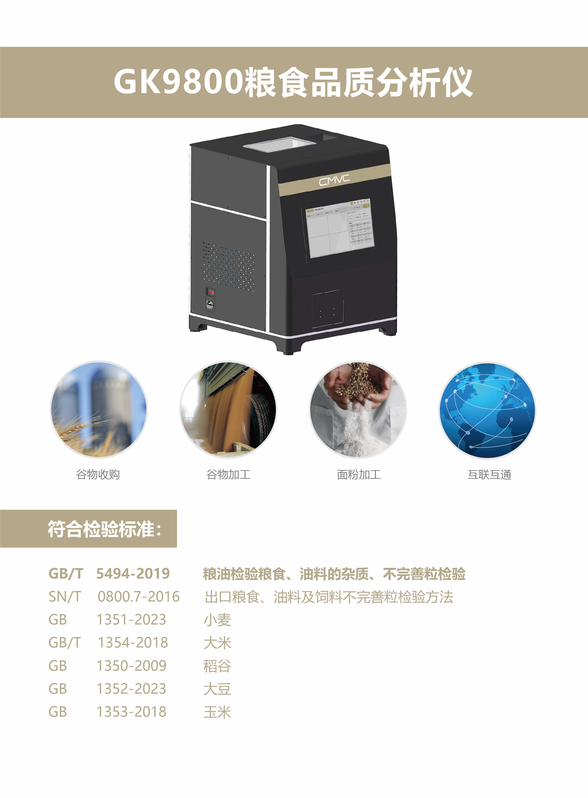 GK9800型粮食品质分析仪是一款用于检测大米、小麦、大豆、玉米、高粱、稻谷、糙米等粮种的不完善粒的自动化设备。作为粮食质量重要指标之一的不完善粒检测,因传统人工操作的主观性不同而造成的误差较大,效率较低,不易有统一的标准,GK9800粮食品质分析仪可对被检测物的各项检测指标进行较为客观、准确、高效的检测评估,检测数据便于保存,提高了粮食检测水平。