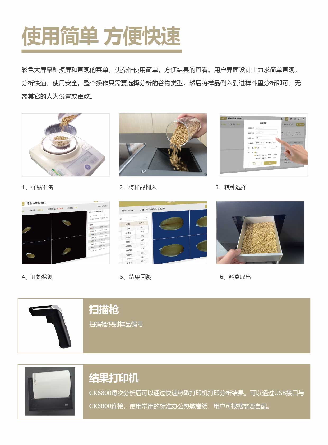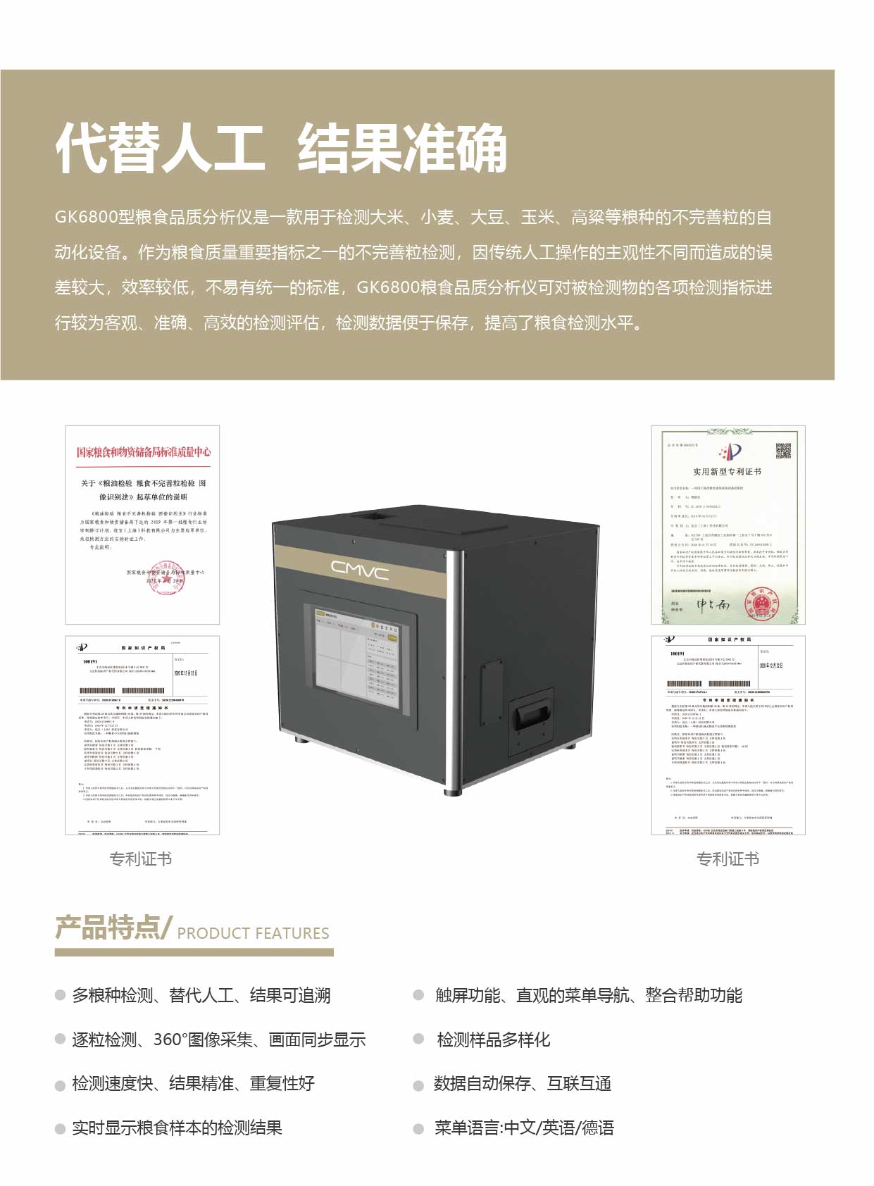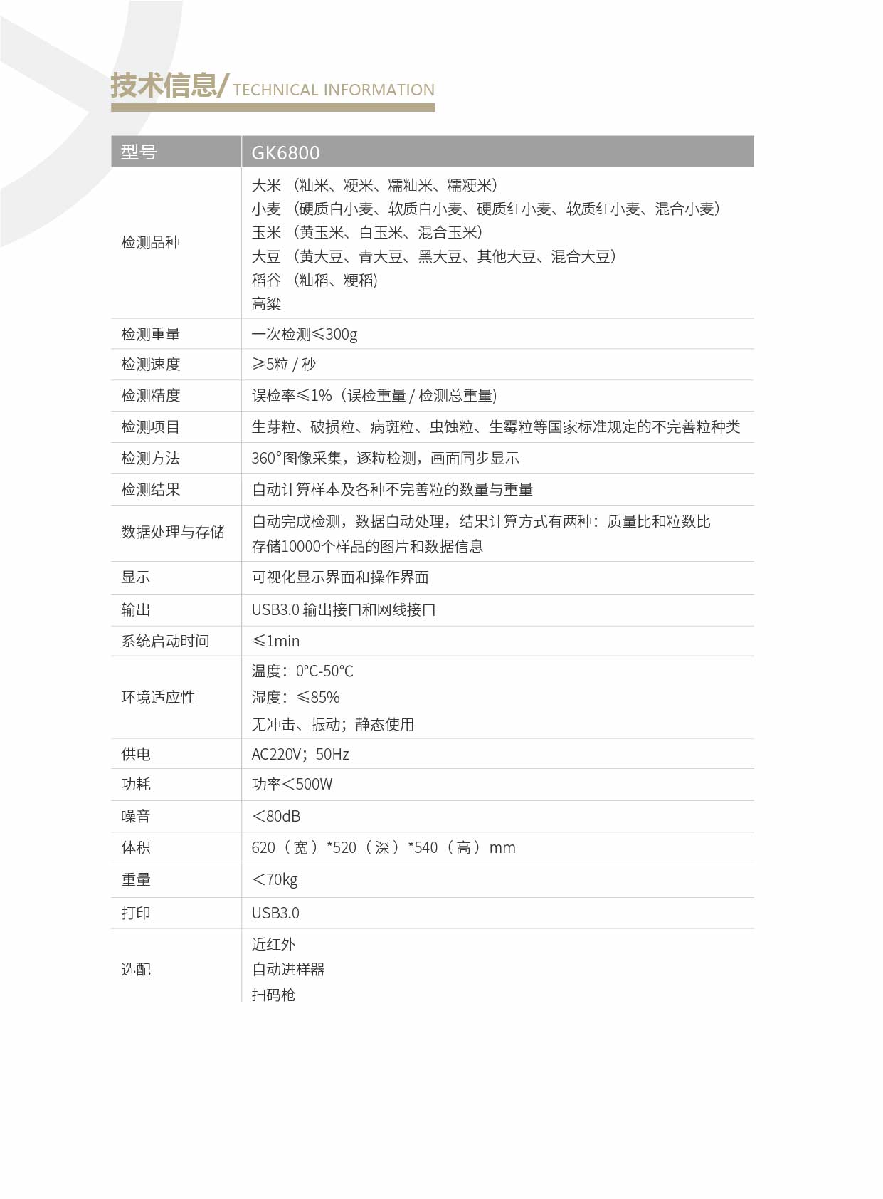 GK6800型粮食品质分析仪是一款用于检测大米、小麦、大豆、玉米、高粱等粮种的不完善粒的自动化设备。作为粮食质量重要指标之一的不完善粒检测,因传统人工操作的主观性不同而造成的误差较大,效率较低,不易有统一的标准,GK6800粮食品质分析仪可对被检测物的各项检测指标进行较为客观、准确、高效的检测评估,检测数据便于保存,提高了粮食检测水平。