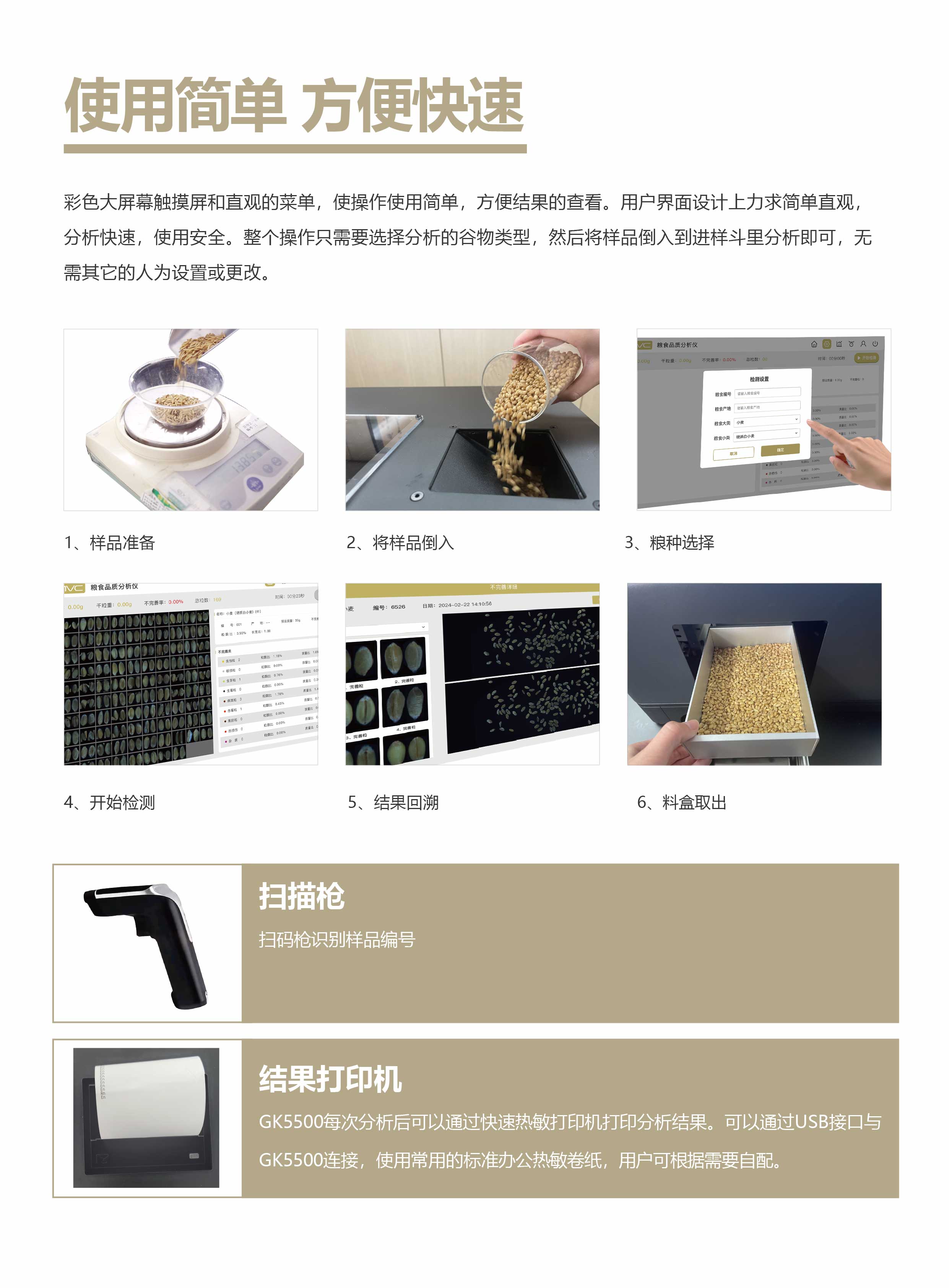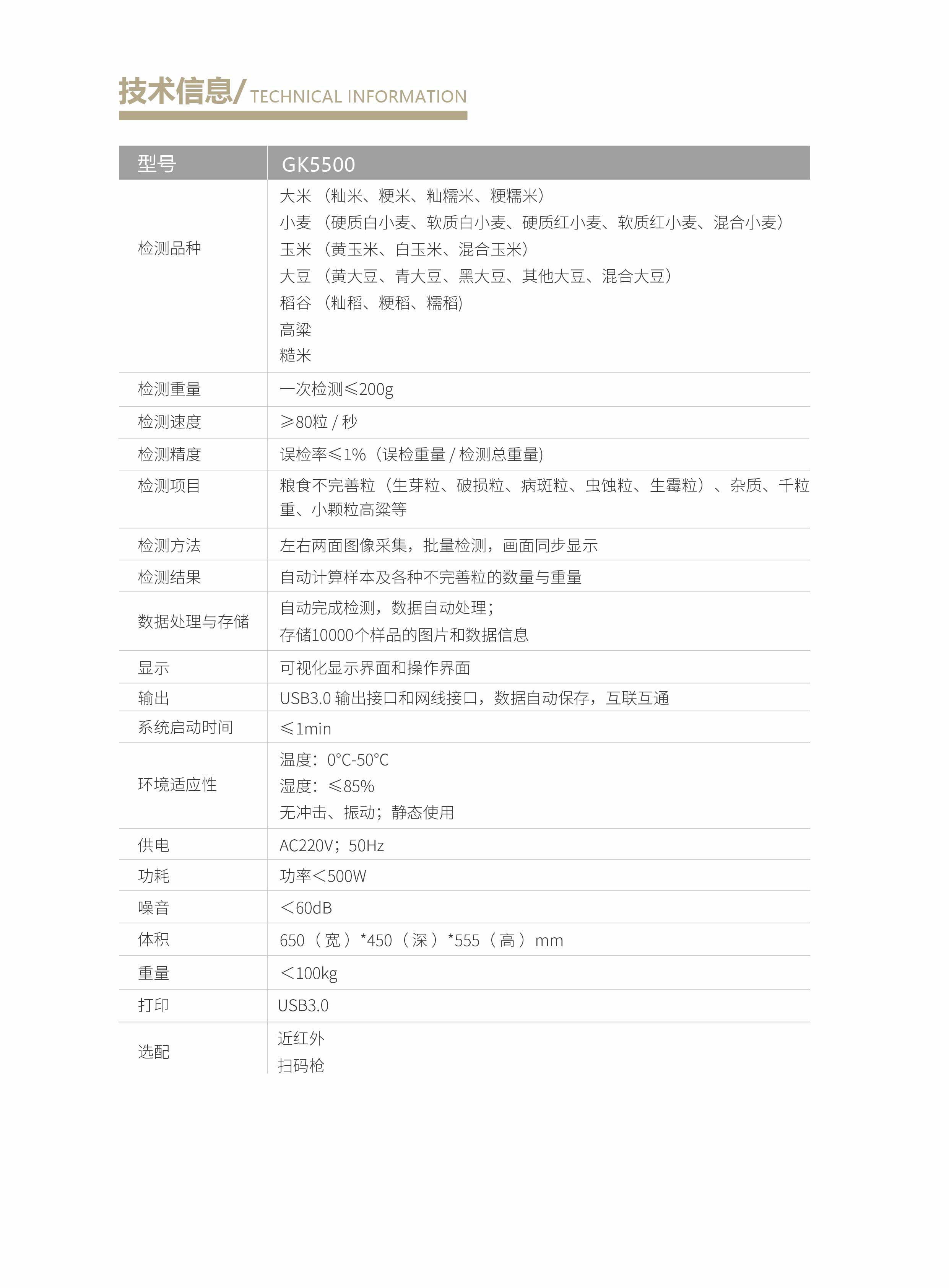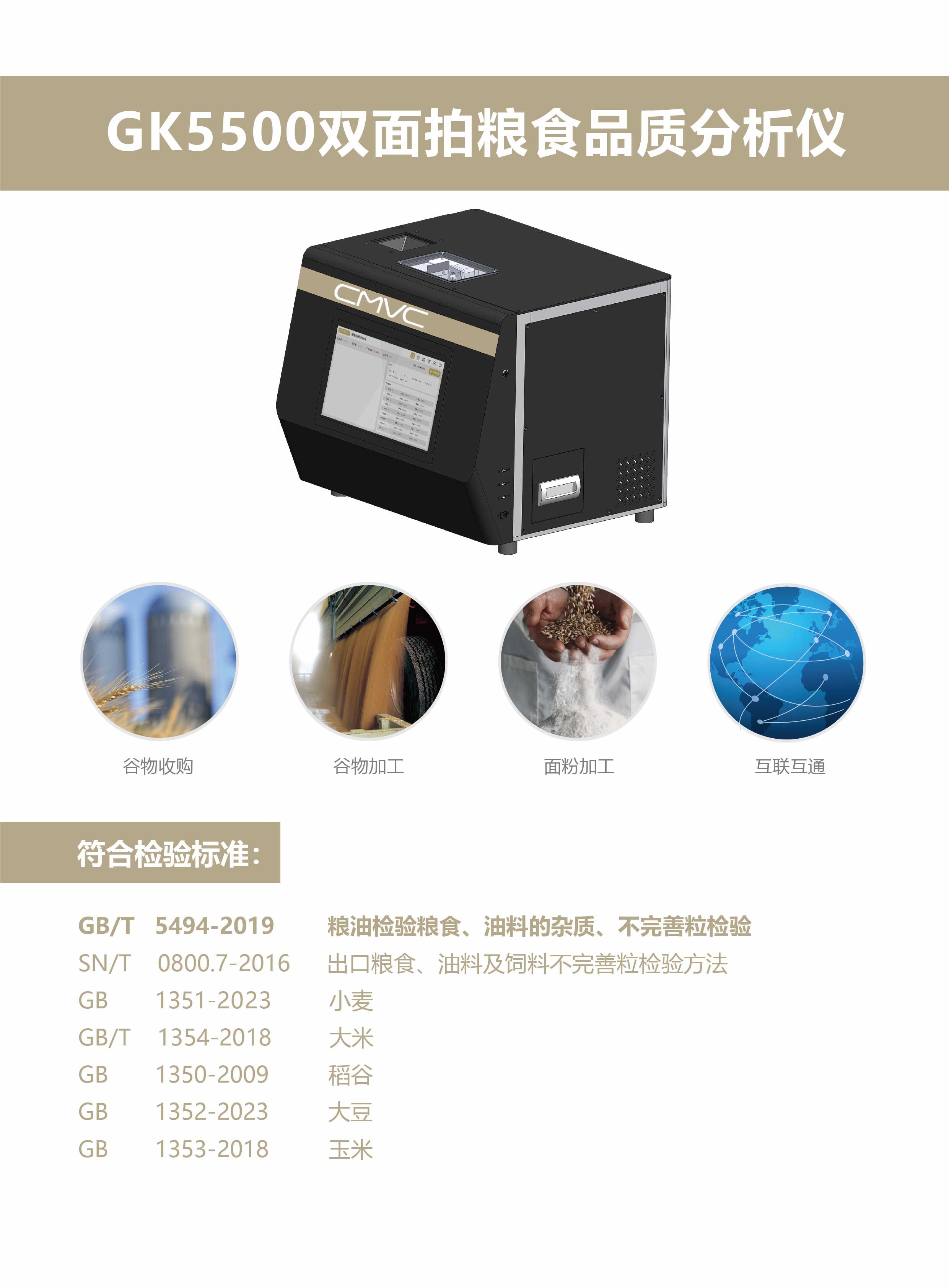 GK5500双面拍粮食品质分析仪是一款用于检测大米、小麦、大豆、玉米、高粱、糙米、稻谷等粮种的不完善粒的自动化设备。作为粮食质量重要指标之一的不完善粒检测,因传统人工操作的主观性不同而造成的误差较大,效率较低,不易有统一的标准,GK5500双面拍粮食品质分析仪可对被检测物的各项检测指标进行较为客观、准确、高效的检测评估,检测数据便于保存,提高了粮食检测水平。