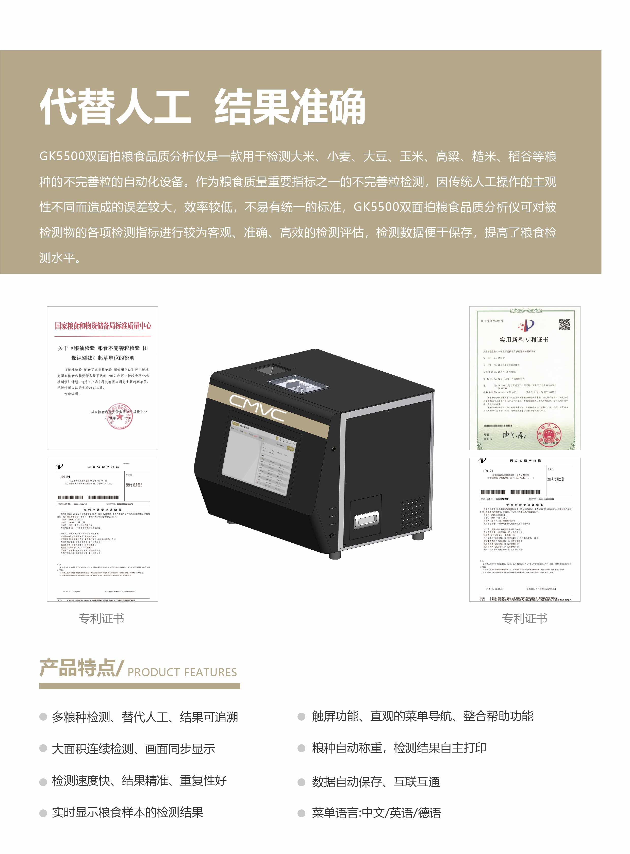 GK5500双面拍粮食品质分析仪是一款用于检测大米、小麦、大豆、玉米、高粱、糙米、稻谷等粮种的不完善粒的自动化设备。作为粮食质量重要指标之一的不完善粒检测,因传统人工操作的主观性不同而造成的误差较大,效率较低,不易有统一的标准,GK5500双面拍粮食品质分析仪可对被检测物的各项检测指标进行较为客观、准确、高效的检测评估,检测数据便于保存,提高了粮食检测水平。